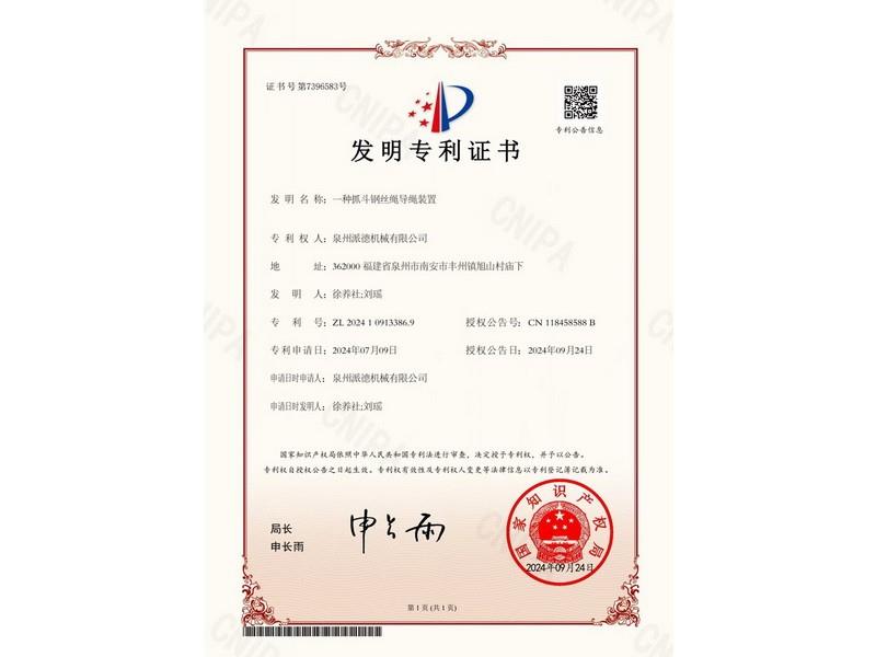 Invention Patent Certificate (a grab bucket steel wire rope guide device)